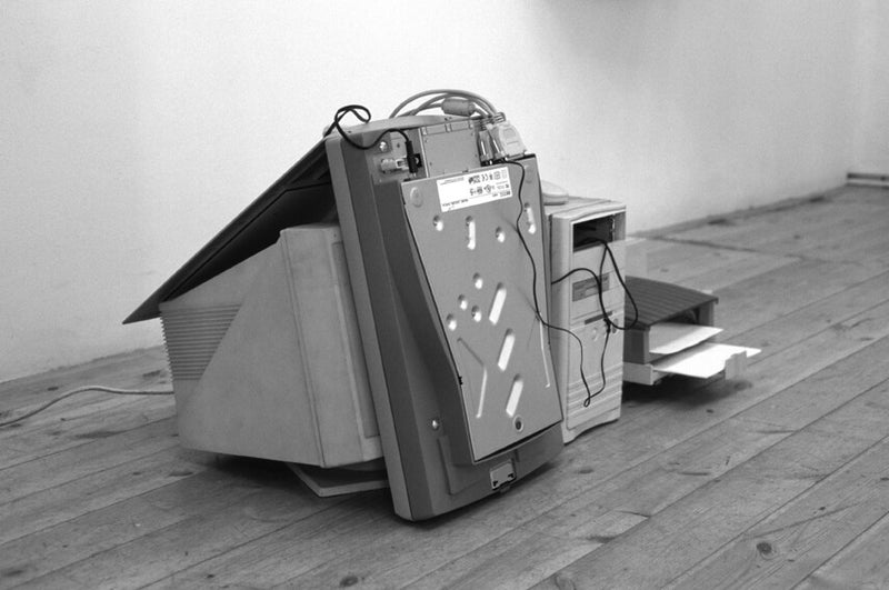 The computer’s hard disc is programed, through the keyboard, so that the scanner (which is connected to the computer) scans randomly and then also the printer (which is connected to the computer) prints at random the scanned pictures. The scanner is placed in front of the monitor, so when the scanner gets the order to scan, he scans the surface of the monitor. He scans the surface together with the actual programming text, which is on that particular time displayed on the monitor. Afterwards in random, the printer prints the scanned pictures.