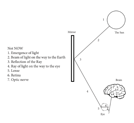 It takes approximately 8 minutes and 20 seconds until the ray from the Sun reaches the work, is reflected by the work, and then reaches the senses of the viewer (eyes) and from there, information is conveyed to the viewer's brain.