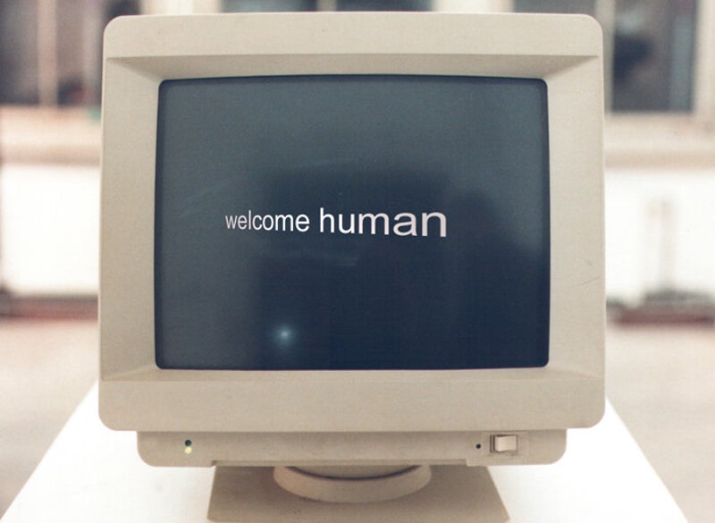 In the middle of the entrance of the exhibition “Implosion” a pedestal was placed with a computer monitor on top. Every visitor who wanted to visit the exhibition had to pass by it. On the monitor the visitor could read the text: “welcome human” and hear a synthetic sound with the same words. In this exhibition of eight FILOART groups there was no artist, curator or anybody else to host the guests – the computer was the only one who welcomed visitors.